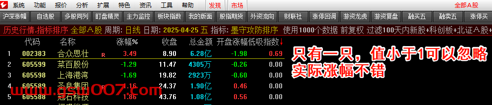 数值越大越优(一般大于 1 即可),若出现 3 个标的,优先选取数值前二进行分仓操作。电脑端:使用排序指标,通过快捷键 “.401” 进入排序界面。